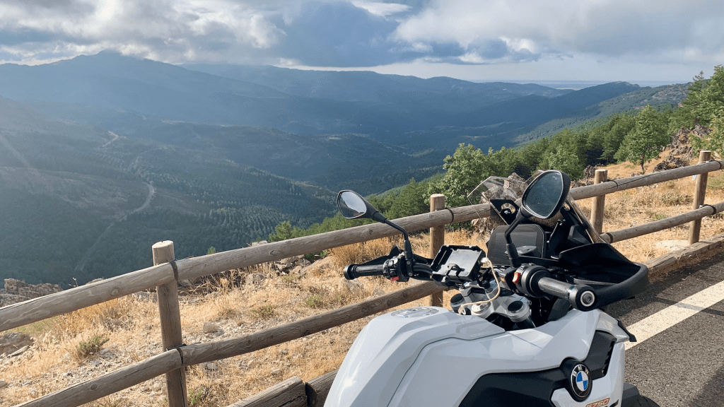 Lo cierto es que la BMW ha empezado a botar al poco de tomar esa curva a derechas, subiendo el repecho, en el nacimiento de esta preciosa vía ahí, justo en Robledillo de la Jara. La carretera queda abierta al caminante, al ciclista, al motero y al de la furgoneta blanca y veloz de gremio tempranero. Porque no eran las ocho de la mañana cuando he puesto el modo enduro y la moto ha dejado de rebotar para convertir la ruta en algo suave y verticalmente sinuoso. Y es que la F750GS tiene un modo de conducción, que no sé en qué consiste que, si lo pones, ella se encarga de resolver ciertas cosas. Funciona como un abogado. Tú le dices por dónde y él se encarga de gestionar las cosas para que la vida sea más mullida de lo que sería sin él. Pues con esta moto pasa eso, que tiene tecnología en la suspensión, en el frenado, en la aceleración, en la tracción, tiene tecnología que hace que puedas ir a lo tuyo sin andar distraído en cosas que, en realidad, no te interesan, porque es mucho más atractivo el paisaje que el Señor de los paisajes se marcó aquí que las mierdas de las vacas que pisas, que he pisado unas cuantas. Siempre pisamos mierda de vaca.